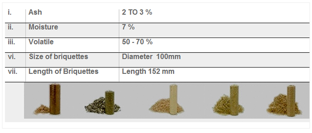 Fuel briquette is black / brown in colour. When agro-waste of cellular nature is briquetted, it produces low cost, high calorific value fuel which can from a good substitute for wood and coal. This implies conversion of waste into a useful energy source. The end product has the following typical proximate analysis.