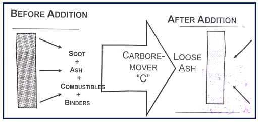 When a properly proportioned quality of Carboremover-C is applied in furnace, the volatile active agents of this product come in contact with the deposits. The resulting action is as follows.